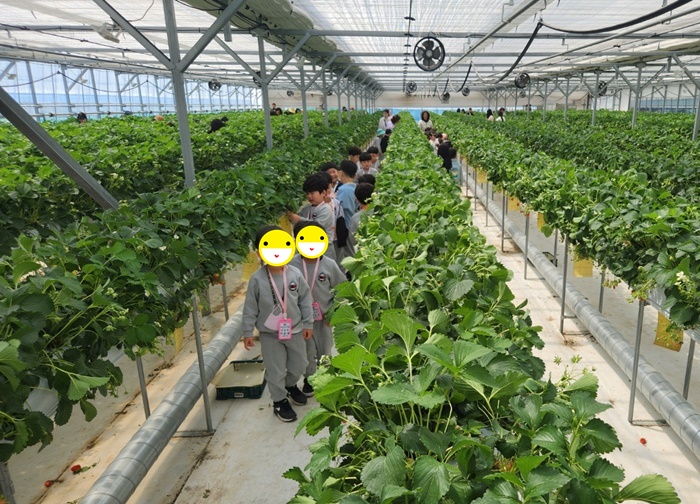 함께 빨갛게 익은 딸기를 따먹는 친구들
